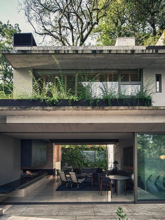 Площадь дома Casa CG, спроектированного архитекторами Lote Studio, составляет 114 кв.м. Достаточно простое по своей форме квадратное здание состоит из девяти частей: восемь из них деревянные и образуют внешние секции, а еще одна — круглая винтовая лестница — сделана из бетона. Для возведения основного каркаса использовались ламинированные деревянные балки. Многослойная структура конструкции основного уровня скрывает лестницу от посторонних глаз. Приподнятый над землей особняк словно парит в воздухе, защищая живые растения и почву под ним. Из окон и с балкона открываются живописные виды во всех направлениях.