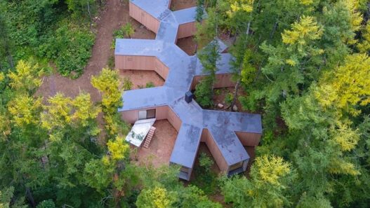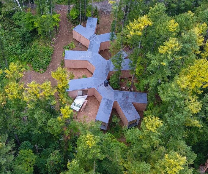 Необычное здание площадью 230 кв. м. было построено в лесу, причем ни одно из существующих здесь деревьев в процессе проведения работ не уничтожили. Многочисленные изолированные комнаты с большими панорамными окнами объединяет длинный коридор. Сверху такое сооружение похоже на ветку дерева. Внутри имеется три спальни, кухня, рабочий кабинет столовая и гостиная.