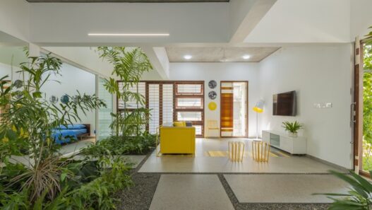 Это двухэтажное здание с индивидуальным дизайном построили для молодой семьи в деревне Теваккал. Площадь особняка, названного «Дом, излучающий свет», составляет 274 кв. м. Его жильцы не хотели терять связь с природой, поэтому внутри сооружения разбили внутренний сад, а фасады украсили разнообразными цветущими растениями.