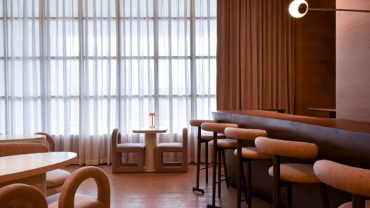Кафе Sequel BKS входит в сеть ресторанов и торговых точек органических продуктов. Чтобы создать в таком помещении с гибкой планировкой атмосферу безмятежности были использованы изысканные текстуры, а землистые и бежевые оттенки должны напоминать посетителям о продуктах фермеров. Минимум острых углов, перегородки с плавными очертаниями и извилистые диваны позволили сделать интерьер «текучим». Белые бусы, изготовленные вручную, будто парят над столиками.