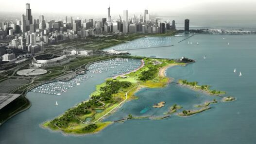 Искусственный остров в Чикаго к 2017г. планируют превратить в крупный городской Парк тысячелетия. Идеально ровная взлетно-посадочная полоса бывшего аэродрома преобразована с помощью завезенной земли. Архитекторы создадут разнообразный рельеф, который станет домом для шести различных экосистем. Здесь появятся зоны: дубовая роща, прерия, влажные болотистые луга, а также пруды, соединенные с озером Мичиган через узкий канал. На склоне холма будет построен большой концертный холл, а береговая линия станет прекрасным местом для ловли рыбы. Создатели проекта также планируют специально затопить у берега старенький лайнер — чтобы дайверы могли исследовать подводный мир. В парке также будет обустроен огромный каток под открытым небом.