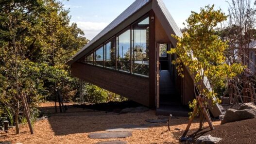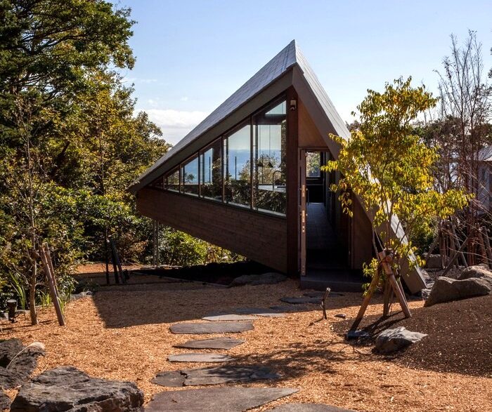 Проект этого особняка разработала студия Moriya and Partners из Страны восходящего солнца. Одна из вершин необычного треугольного сооружения опирается на сваю из металла, другие — на скалистые выступы. Таким образом, приподнятый дом буквально «парит» над земной поверхностью.