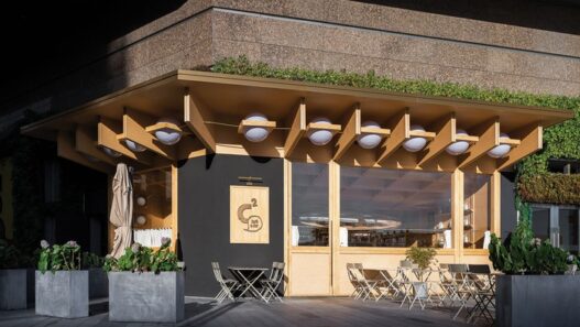 Внутри ресторана, площадь которого составляет всего 75 кв. м., смонтирована футуристическая зеркальная инсталляция. Пространство заведения разбито на разные функциональные зоны — общественная площадка, кухня, барная стойка и т.д.