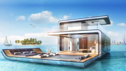 На уровне воды расположен второй этаж. Здесь предусмотрена гостиная, столовая и кухня. Зоны отдыха с джакузи, мини-баром и т.п. находятся на верхней палубе плавучей виллы.