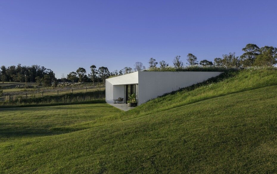 Этот проект, названный Buried House, разработала дизайнерская фирма Kallos Turin. Одноуровневое здание площадью 345 кв. м. возвели недалеко от озера на земельном участке, который отличается непростым рельефом. Дом получил плоскую зеленую крышу и оказался встроенным в склон холма. Кроме этого, на главном фасаде здесь предусмотрены большие раздвигающиеся стеклянные панели.