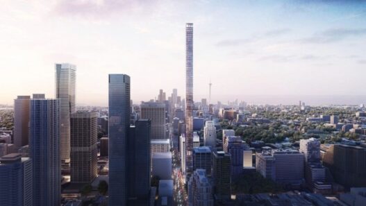 Небоскреб собираются возвести в центре канадского города Торонто. Эта высотка будет иметь 87 этажей, основная часть которых предназначена для размещения 332 квартир. Причем жилые пространства тут планируются самые разные по размеру – от изолированных помещений с одной спальней до двухуровневых апартаментов. Интересной особенностью сооружения станут деревянные жалюзи, защищающие комнаты от солнечных лучей и позволяющие жильцам контролировать их освещенность.