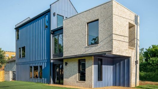 Дом состоит из двух разных объектов. Двухуровневое сооружение из светлого кирпича фактически сливается с трехэтажной структурой из стали. Часть здания с лестницей разделяет эти два блока.