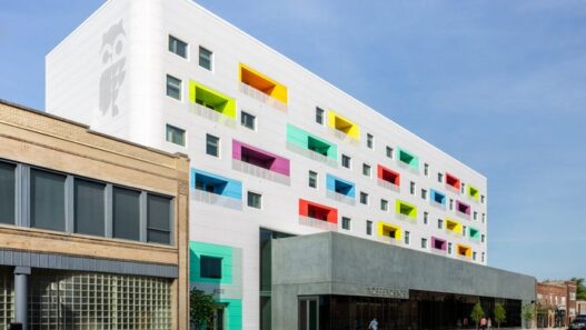 Проект получил название Independence Library and Apartments. В новостройке с белым фасадом и яркими балконами имеется 44 квартиры. Они предназначены для арендаторов, возраст которых превысил 62 года, а доходы — ниже среднего. Кроме этого, в таком здании предусмотрена прачечная и фитнес-центр.