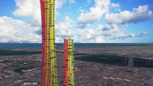 Высота одной башни составляет 400 метров (139 этажей), второй — 200 метров (78 этажей). По расчетам архитекторов, на них понадобится около 5000 контейнеров различных размеров. Поселиться в двух таких небоскребах смогут 1300 семей.