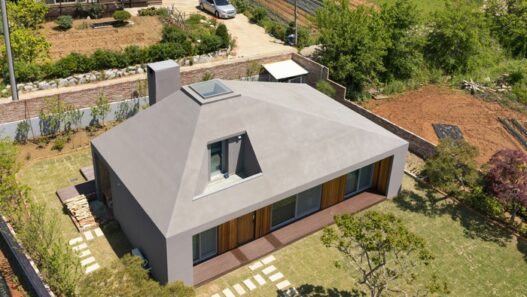 Двухэтажное здание площадью 99 кв. м. спроектировала студия AtelierJun. Оригинальный дом в поселке Гилджик-ри не используется для постоянного проживания: городская семья отдыхает здесь во время отпуска или в выходные дни. Одной из самых любопытных особенностей подобного сооружения является четырехскатная бетонная крыша со световым люком квадратной формы.