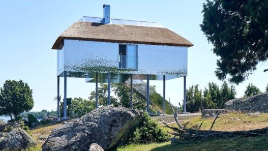 Такая конструкция, по замыслу автора проекта, должна помочь полному «слиянию» сооружения с окружающей природой. Здание установлено на сваях и получило зеркальный фасад и пол. При этом крыша у него соломенная. Интерьер дома отделан светлым деревом. Гости заповедника Эриксберг могут арендовать такой объект недвижимости и затем наблюдать за дикими животными через прозрачный пол и большие окна.