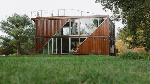 Специалисты этой фирмы возвели из шести стандартных контейнеров современный двухуровневый особняк. Общая площадь такого необычного здания с террасой на крыше, расположенного в американском городе Клейврэк, достигает 178 кв. м.