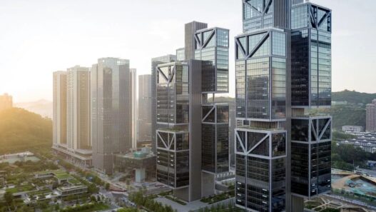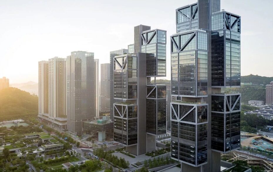 Эти два небоскреба спроектировали для города Шэньчжэня специалисты Foster + Partners. В оригинальных по своей форме зданиях разместилась штаб-квартира компании DJI, занимающейся выпуском дронов. Высота сооружений составляет 213 метров. Каждое из них получило центральную опору, к которой крепятся по шесть больших стеклянных блоков. На уровне 24 этажа (105 метров над землей) башни соединяет 90-метровый мост.