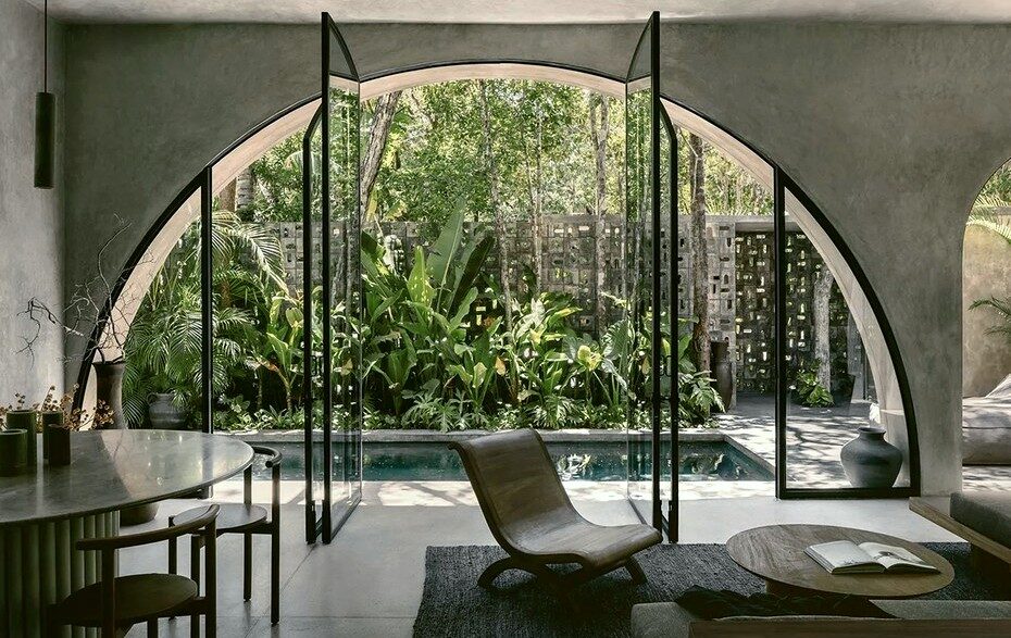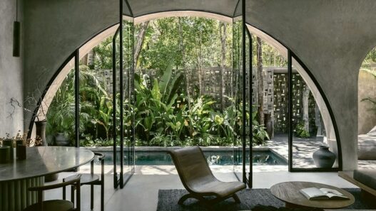 Новый объект с небольшим бассейном, получивший название Villa Petricor, построили рядом с частным пляжем в Тулуме. Площадь этого бетонного дома с арочными окнами составляет около 300 кв. м. Архитекторы стремились к тому, чтобы обитатели виллы могли любоваться тропической зеленью буквально из каждого помещения здания. Две спальни тут получили собственные террасы с гамаком, где можно отдыхать на солнце. Для приготовления пищи и столовой предназначено специальное открытое пространство.