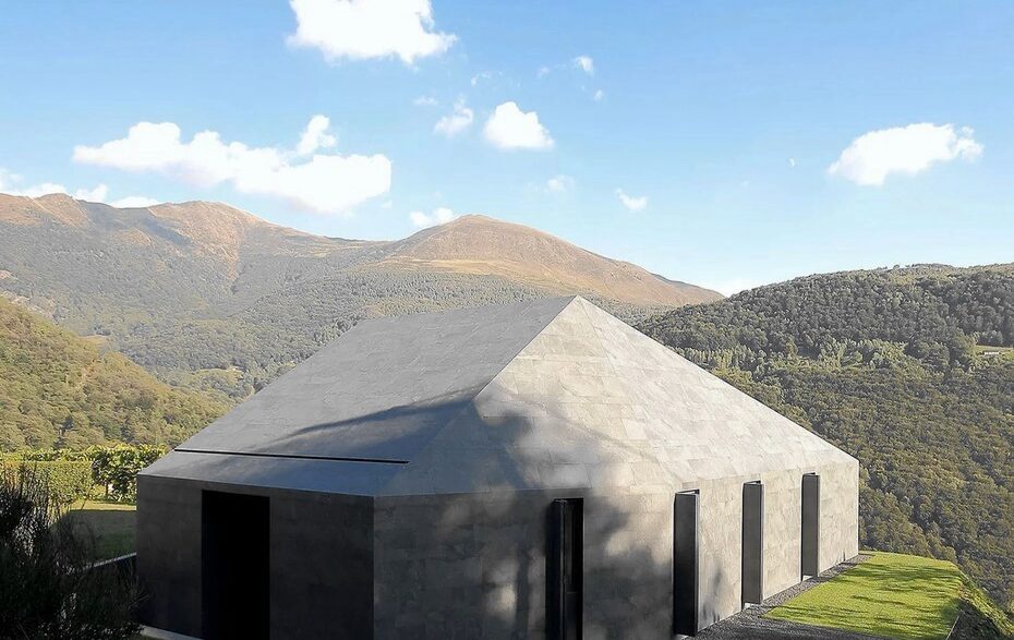 Это деревянное жилое здание площадью 200 кв. м. со скатной крышей возвели всего за несколько дней из готовых элементов. Построенный на склоне холма дом в целом выглядит монолитно за исключением южной остекленной стены. Сооружение облицовано керамогранитом, который фиксируется на алюминиевой фасадной системе. Резиденция практически сливался с пейзажем и имеет нестандартную шестигранную асимметричную крышу, немного смещенную в сторону горы.
