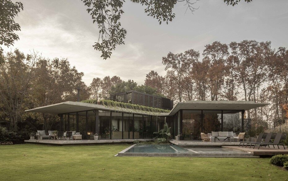 Этот проект был реализован специалистами Estudio Geya в аргентинском городе Итусаинго. Одноэтажный жилой дом общей площадью 730 кв. м., приподнятый немного над землей, получил оригинальную форму в виде буквы X. В одной из четырех образовавшихся в результате выбора такой планировки частей находится столовая, гостиная и кухня, в другой — четыре спальни, в третьей — кинотеатр и место для барбекю, а в четвертой – гараж и хозяйственные помещения. Примечательно, что каждый из таких блоков получил собственный выход на территорию объекта. Внутреннее патио с живыми растениями стало точкой пересечения всех функциональных зон. Рядом с домов расположен L-образный бетонный бассейн с мраморным полом и джакузи, а также палуба для отдыха на свежем воздухе.