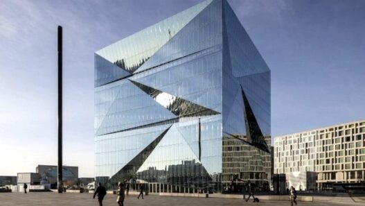 Здание cube berlin общей площадью 20 тыс. кв. м. (надземная часть) построили в центре столицы Германии. Кроме офисных площадей для сдачи в аренду, тут имеется подземный гараж и продовольственный рынок на первом уровне.