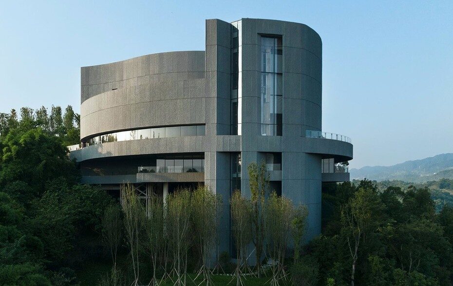 Речь идет об архитектурно-градостроительной выставке Инновационной зоны Лянцзян. Этот павильон расположен на склоне холма, возвышающегося над озером Минъюэ. Объем приподняли над землей на больших опорах, напоминающих сваи. К сооружению ведет извилистая дорога, проходящая через заросли бамбука. В качестве основного строительного материала авторы проекта выбрали бетон, который оштукатурен внутри здания.