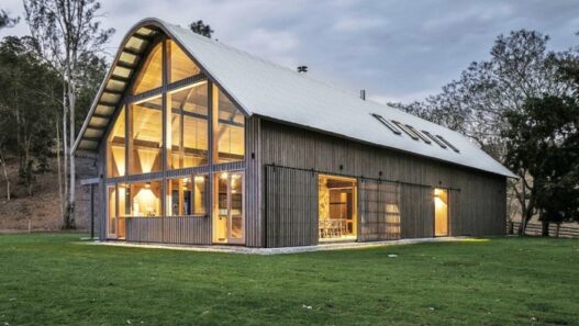 Оригинальный загородный дом с тремя спальнями, мансардными окнами и открытой террасой решили назвать Barn. Этот деревянный особняк построили в пригороде Брисбена. Крыша необычного здания изготовлена из оцинкованного профлиста.