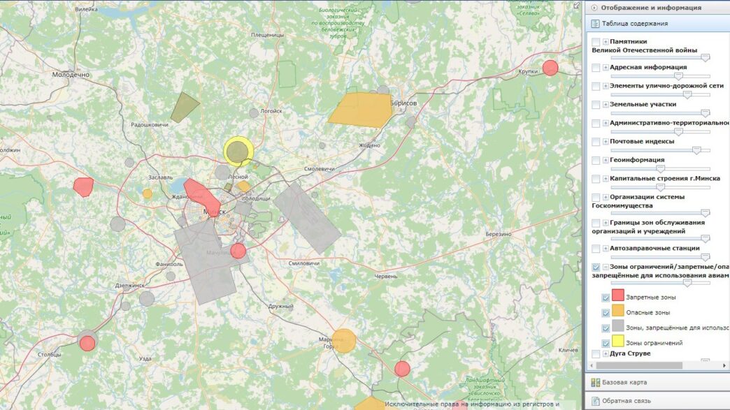 На официальном сайте Государственного комитета по имуществу опубликовано сообщение, в котором говорится, что пространственный слой «Зоны ограничений/запретные/опасные/запрещенные для использования воздушных судов» на карте разработан и актуализирован в соответствии с вступившим в силу постановлением Министерства обороны Республики Беларусь от 9 ноября 2020 г. № 26 «Об установлении перечней элементов структуры воздушного пространства Республики Беларусь».