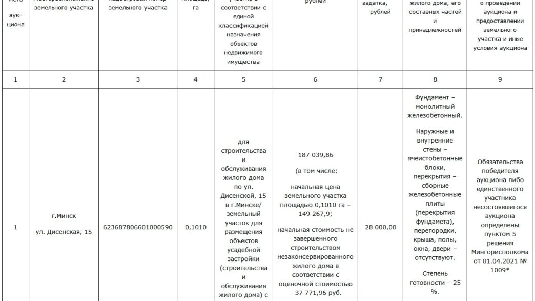 Коммунальное унитарное предприятие «МИНСКИЙ ГОРОДСКОЙ ЦЕНТР НЕДВИЖИМОСТИ» 18 мая 2021 г. проводит открытый аукцион № 02-НС-21 по продаже незавершенного строительством незаконсервированного жилого дома и земельного участка.