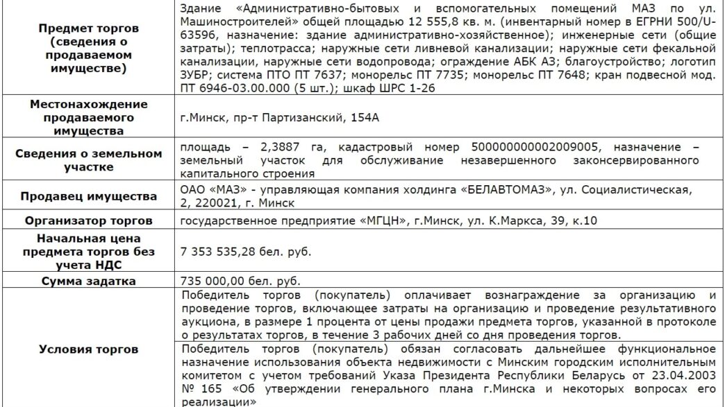 Извещение о проведении 11 июня 2019 года повторных торгов с условиями по продаже единым предметом торгов имущества, принадлежащего ОАО «МАЗ» – управляющая компания холдинга «БЕЛАВТОМАЗ».