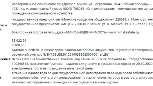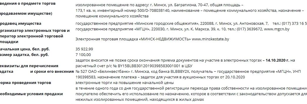 Извещение о проведении 20 октября 2020 года электронных торгов по продаже изолированного помещения, находящегося в собственности г. Минска.