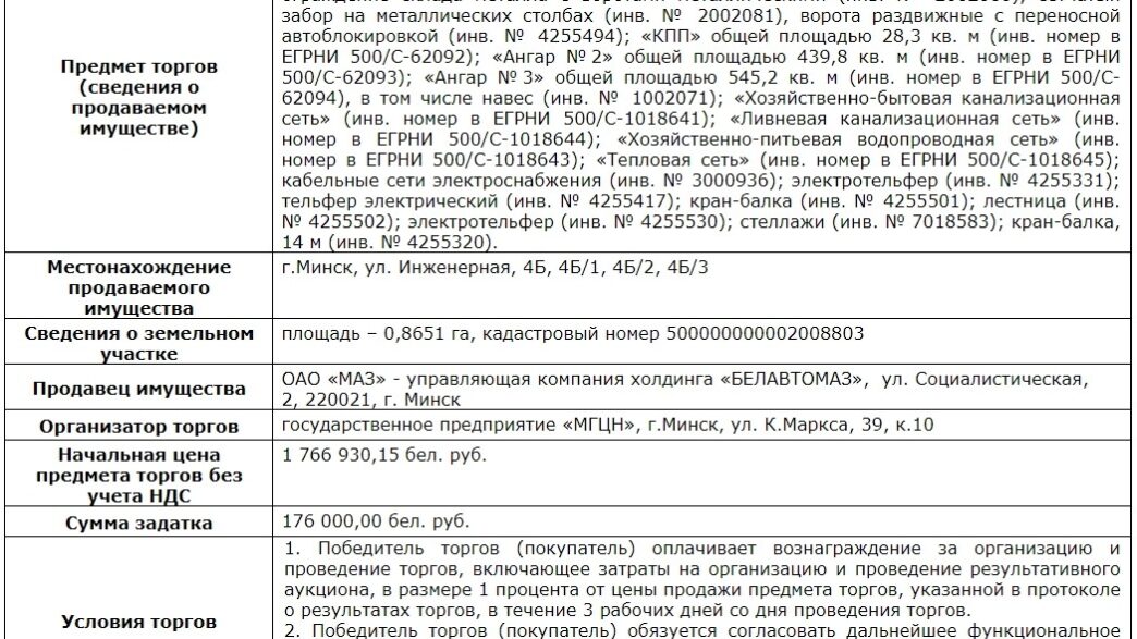 Извещение о проведении 30 декабря 2019 года торгов с условиями по продаже единым предметом торгов имущества, принадлежащего ОАО «МАЗ» – управляющая компания холдинга «БЕЛАВТОМАЗ».
