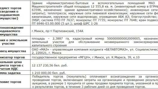 Извещение о проведении 7 июля 2020 года торгов с условиями по продаже единым предметом торгов имущества, принадлежащего ОАО «МАЗ» – управляющая компания холдинга «БЕЛАВТОМАЗ».