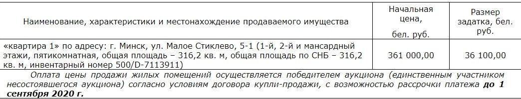 Извещение о проведении 6 июля 2020 года повторных аукционных торгов по продаже жилого помещения, находящегося в собственности города Минска.