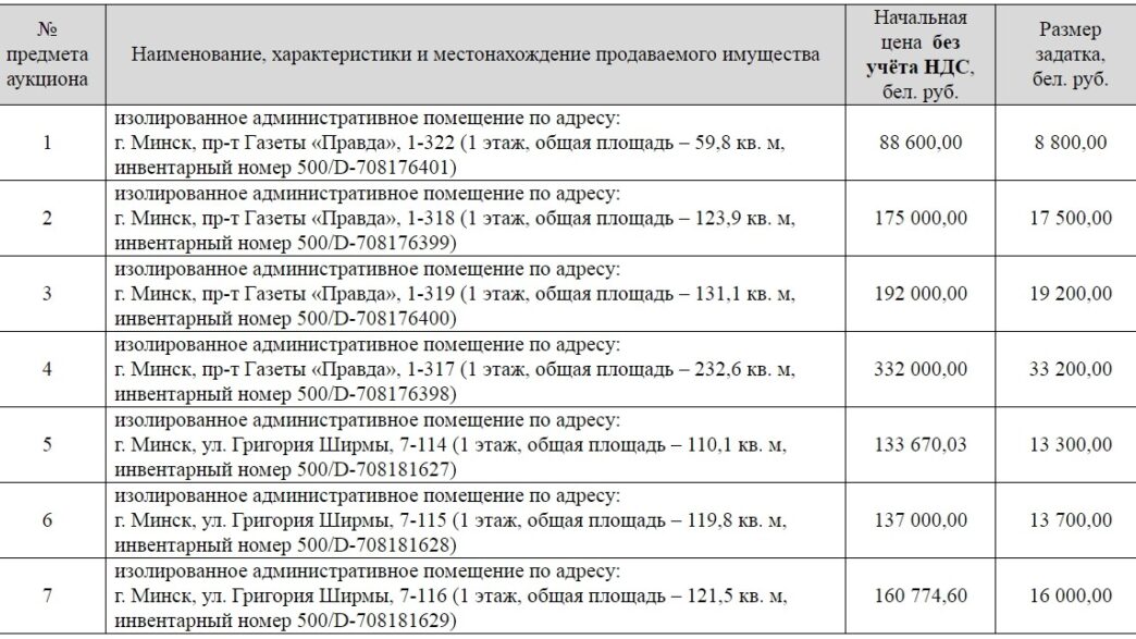 [Завершены] Торги по продаже изолированных помещений, находящихся в собственности г. Минска (пр-т Газеты «Правда», 1 и ул. Г. Ширмы, 7)
