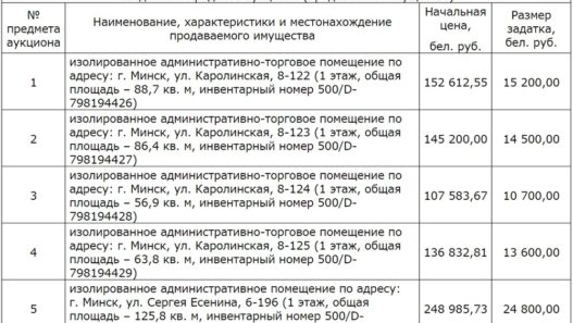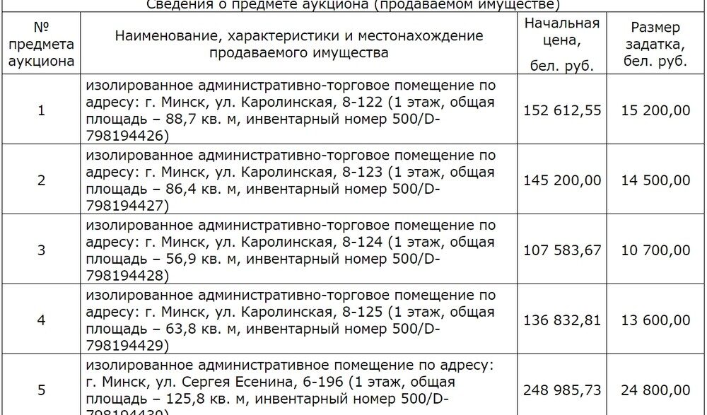 [Завершены] Торги по продаже изолированных помещений, расположенных в г. Минске (административно-торговые помещения по ул. Каролинская, 8 и административное помещение по ул. С. Есенина, 6.)