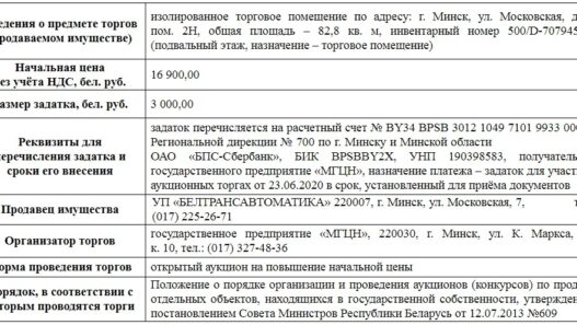 [Завершены] Торги по продаже торгового помещения по ул. Московской, 7 в Минске
