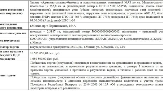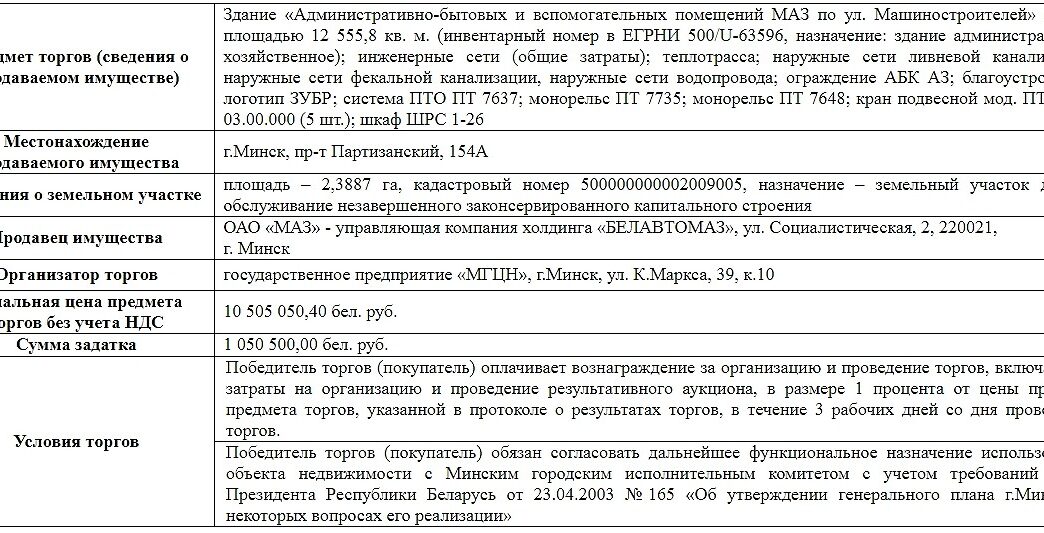 [Завершены] Торги с условиями по продаже имущества (г. Минск, пр-т Партизанский, 154А ), принадлежащего ОАО «МАЗ» – управляющая компания холдинга «БЕЛАВТОМАЗ»