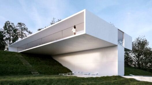Эту нестандартную виллу спроектировали специалисты Fran Silvestre Arquitectos. Сооружение, возведенное на земельном участке с крутым склоном, сформировано двумя перпендикулярными бетонными блоками. Нависающая над склоном основная жилая часть создает тень над просторной террасой рядом с бассейном.