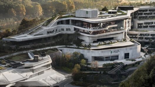 На этом земельном участке недалеко от Нанкина прежде добывали известняк. Архитекторы из гонконгского бюро Cheng Chung Design (ССD) встроили в очень непростой индустриальный ландшафт здание роскошной гостиницы с ресторанами и баром. Новый объект площадью 35 тыс. кв. м. получил сложную угловатую форму с террасами и зелеными крышами.