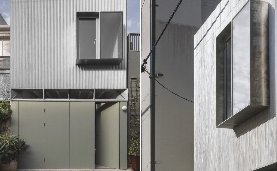 Между тем новое трехэтажное здание со стальным каркасом получило отделку из шлифованного алюминия и фасад, покрытый гофрированной сталью. На самом нижнем уровне этого объема находится гараж с темно-зелеными дверями. На другой стороне данного этажа имеется кухня и столовая, выходящие в сад. Верхние уровни металлического сооружения занимают гостиная, спальня и ванная комната.