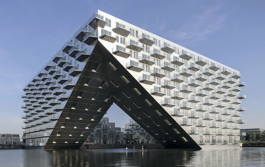Необычное жилое здание площадью 49 тыс. кв. м. спроектировали специалисты Barcode Architects и Bjarke Ingels Group. Данный объект возведен на искусственном острове. Одна из сторон построенного сооружения приподнята и образует большой проем, через которой вода из местного озера проникает прямо во двор.